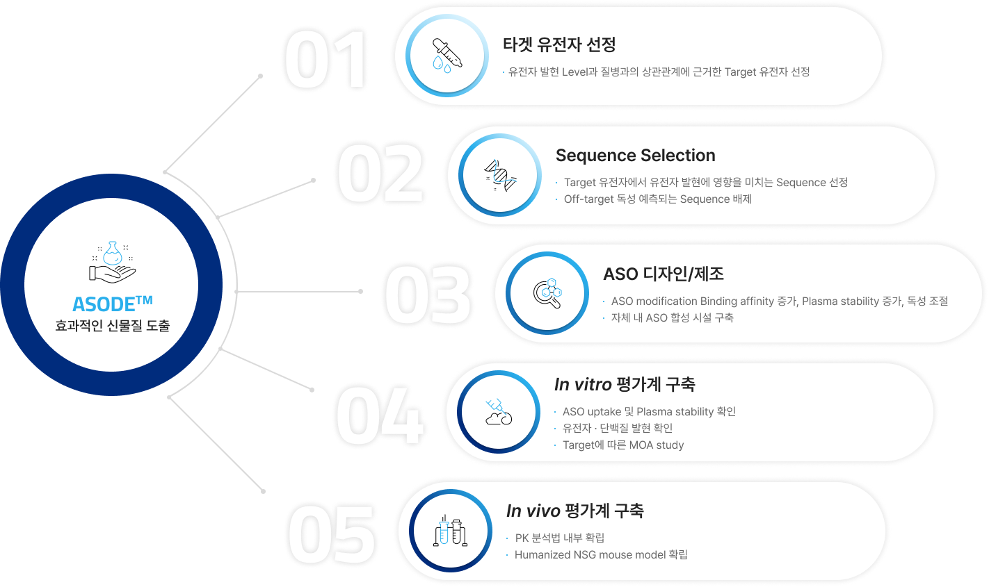 Chemical modification, in vitro/in vivo 평가를 통한 최적의 ASO 도출을 모두 포함하는 ASO 신약 개발 시스템입니다.