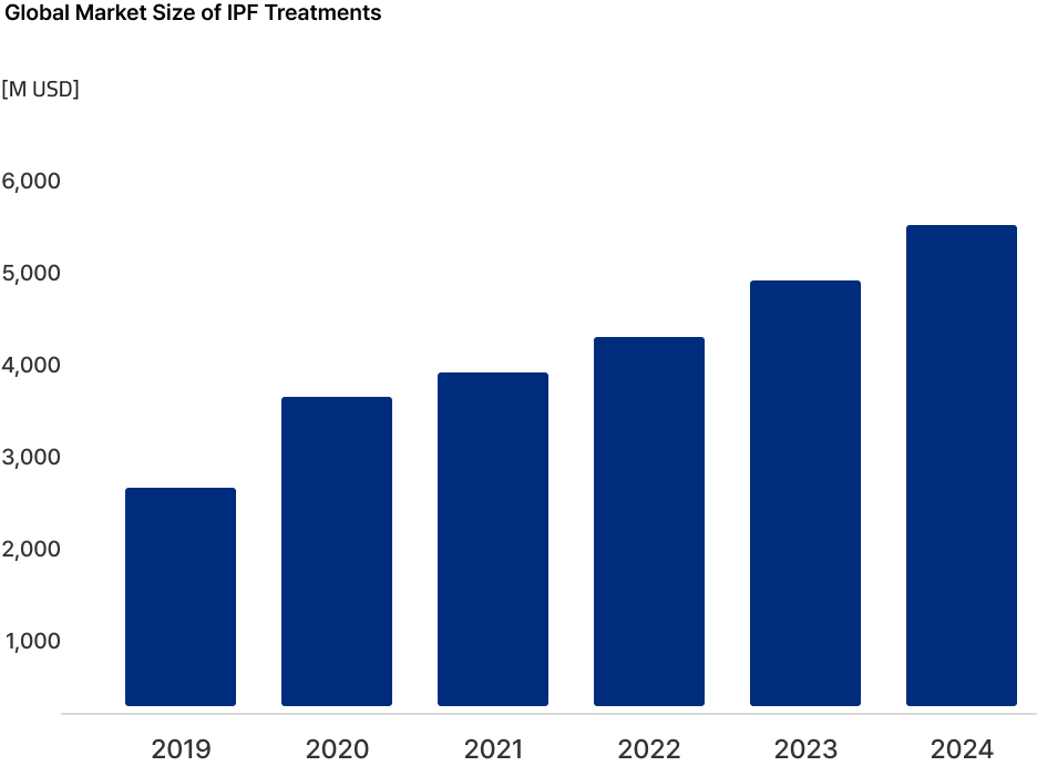 Idiopathic Pulmonary Fibrosis is a form of progressive interstitial pneumonia characterized by the gradual fibrosis of lung parenchyma. The global market for IPF treatments is forecasted to steadily grow from 4.3 billion USD in 2022 to 5.7 billion USD in 2024.