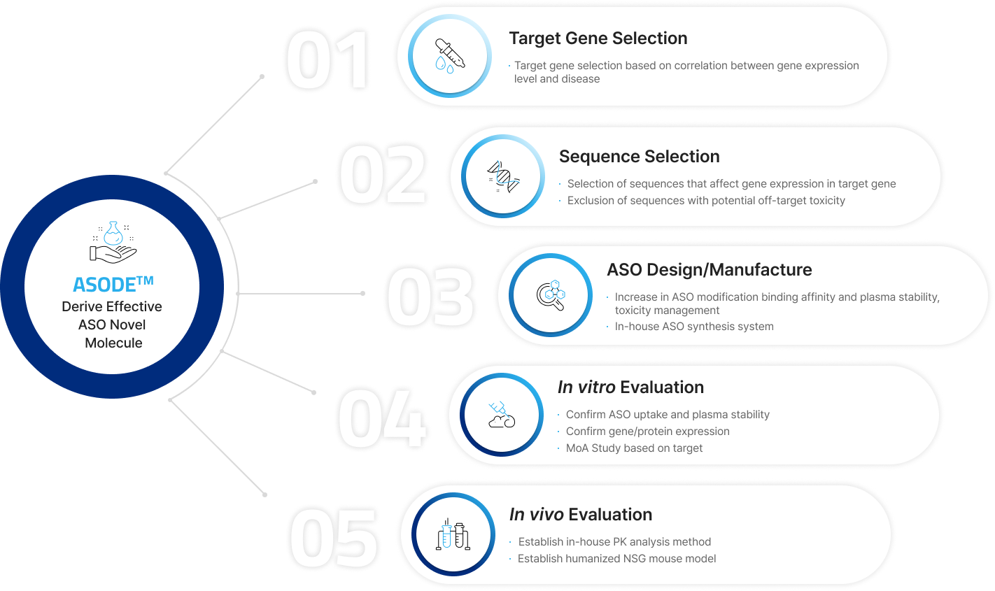 The designed ASOs are synthesized in-house and then novel molecules are derived based on the designed ASOs through in vitro and in vivo evaluation stages.