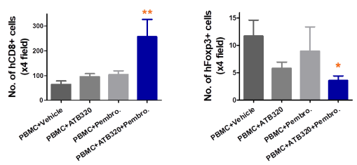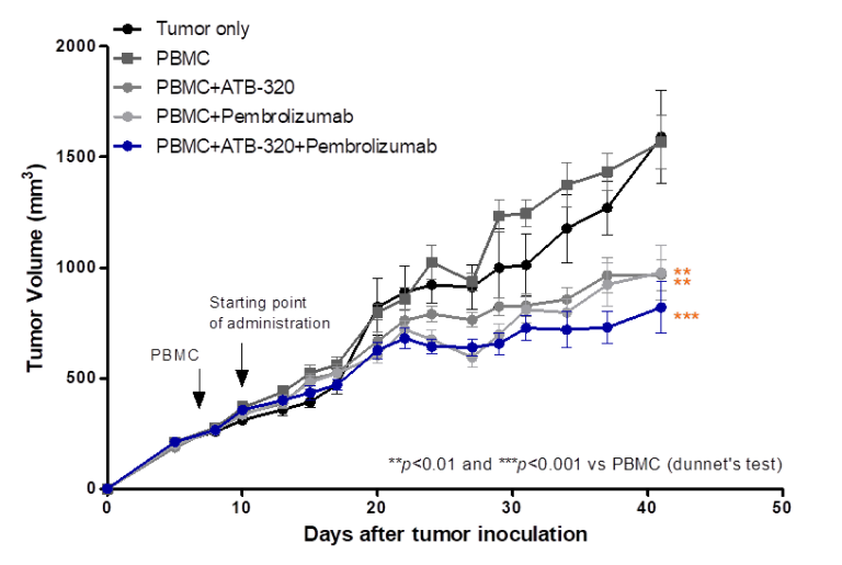 Humanized mouse model에서 Pembrolizumab과의 종양 성장 억제 시너지 항암효과를 확인하였습니다.
